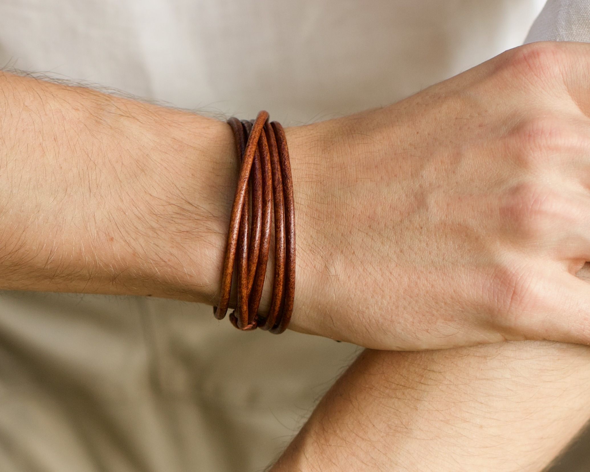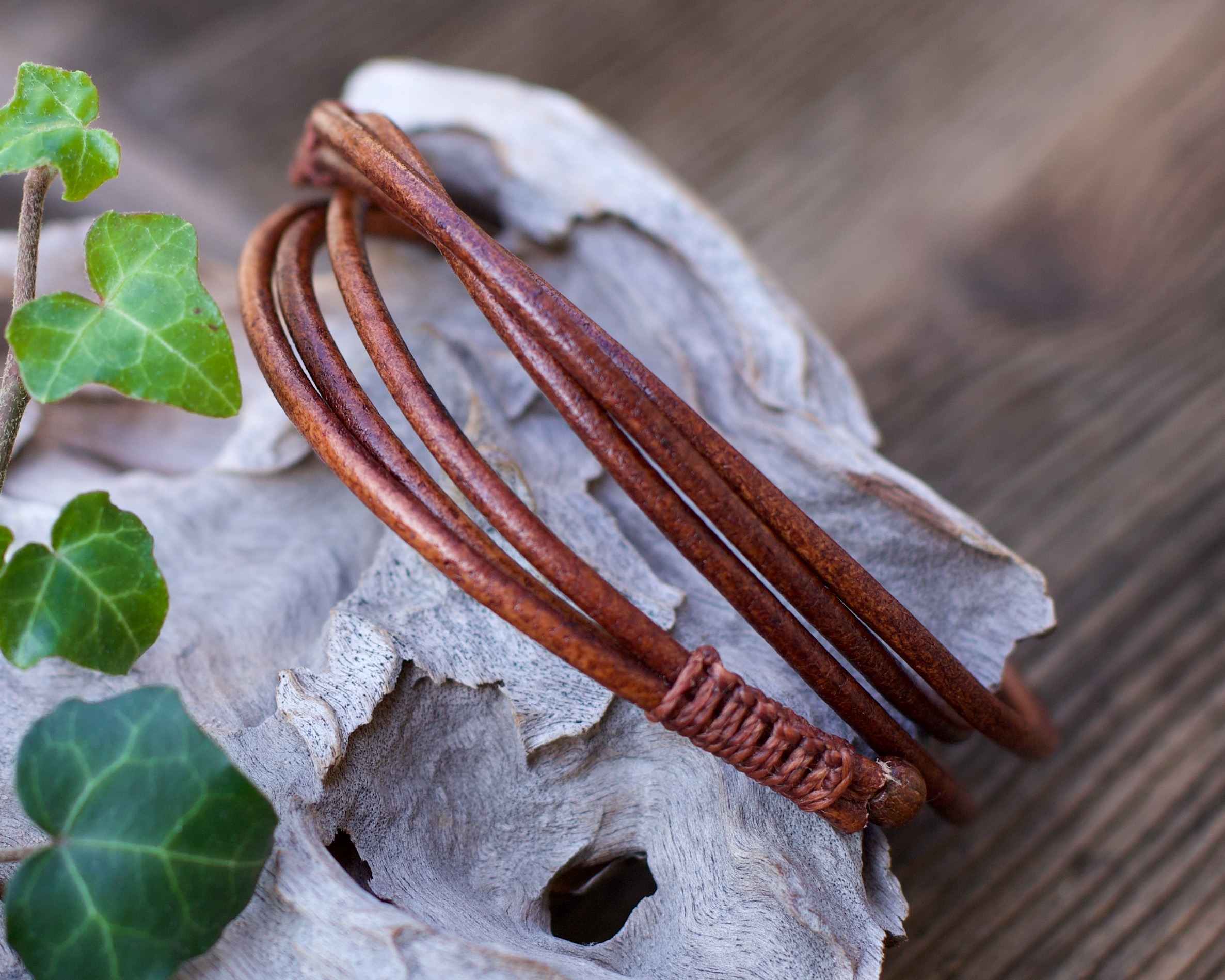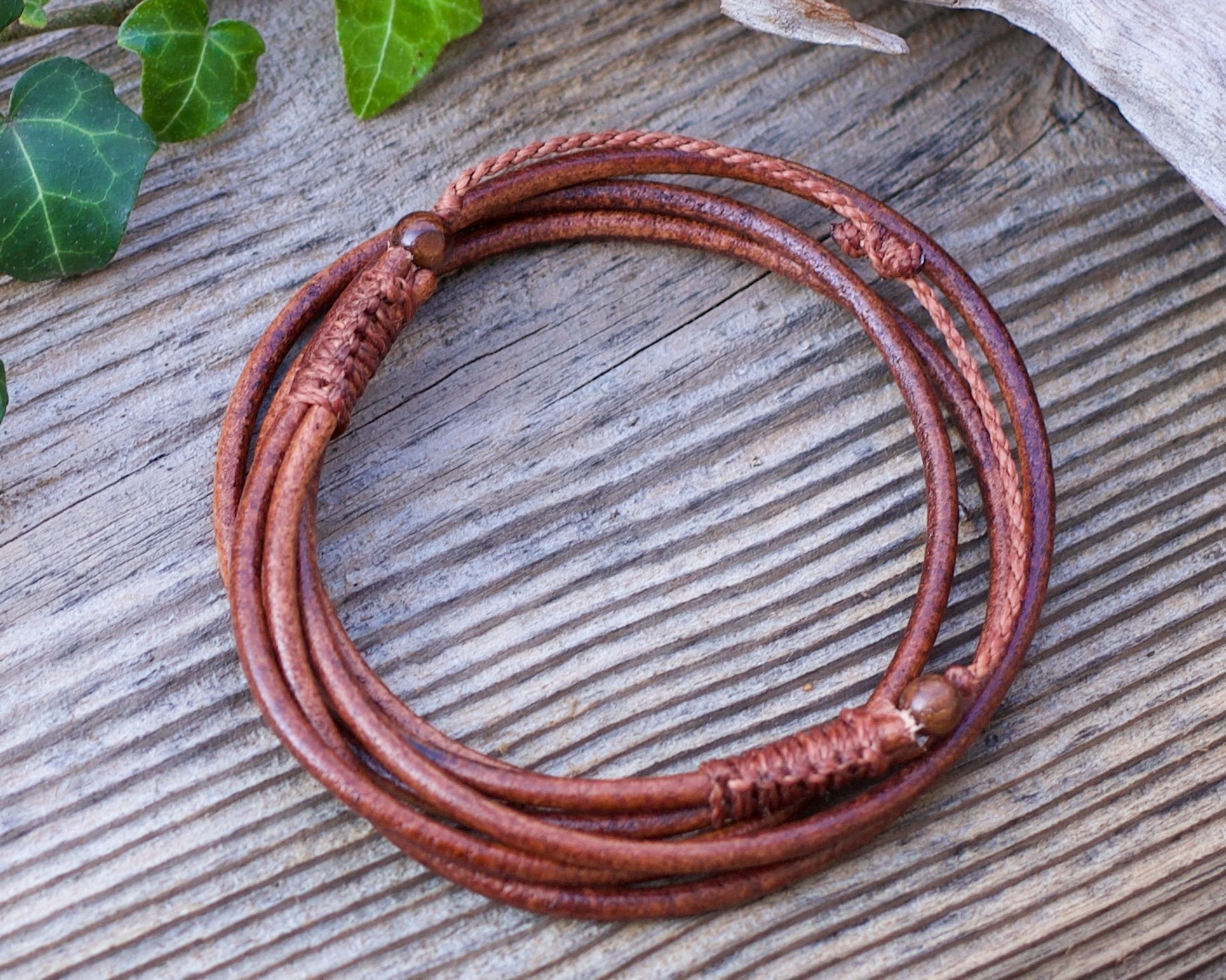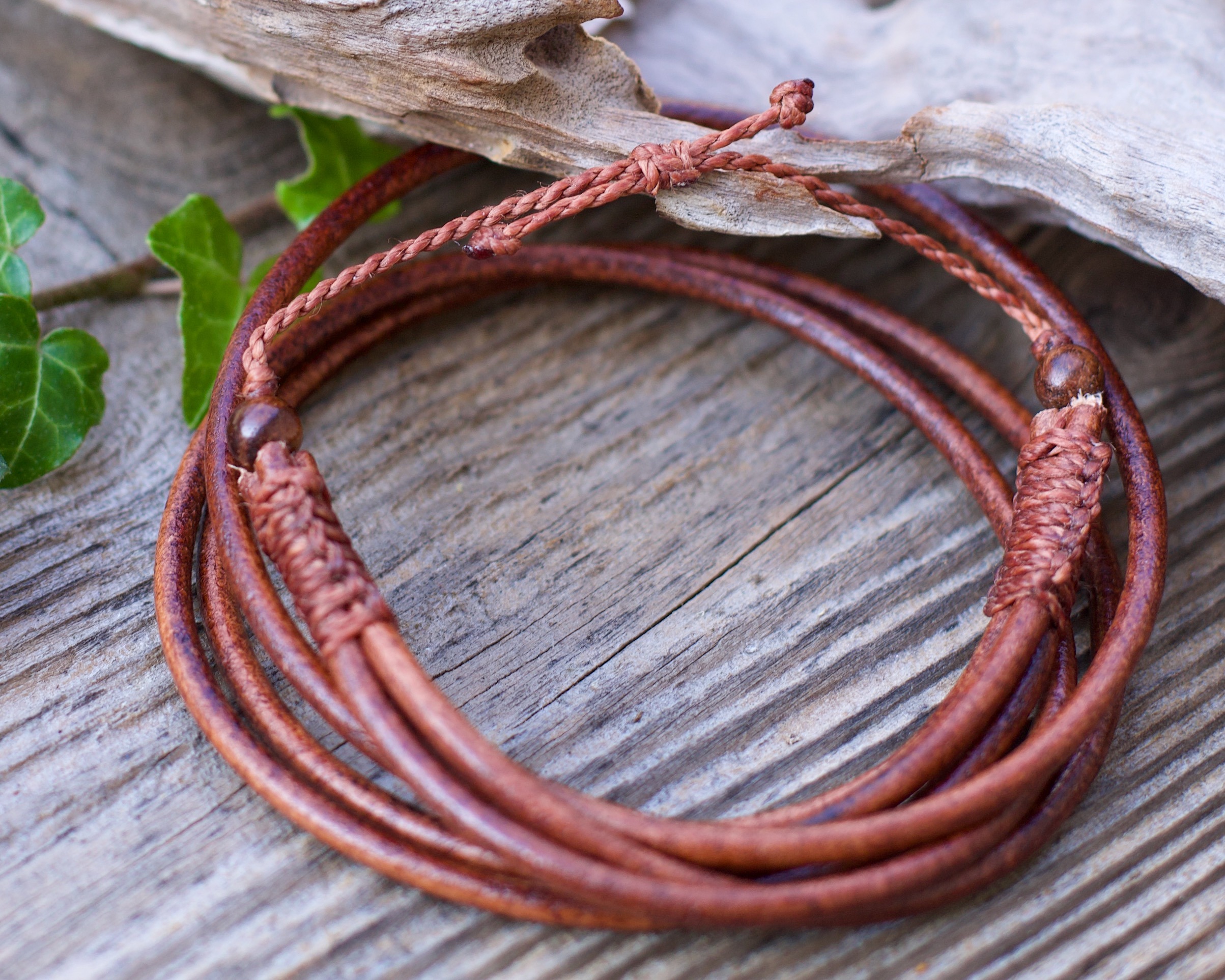 This bracelet is made from natural leather and sandal wood beads.
