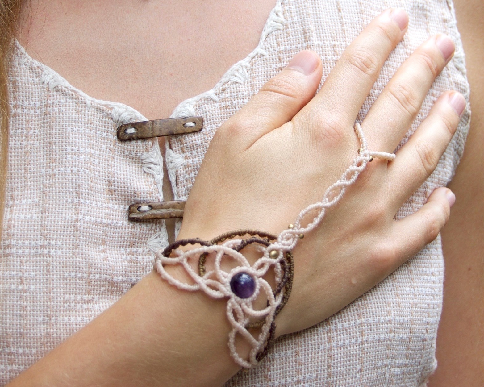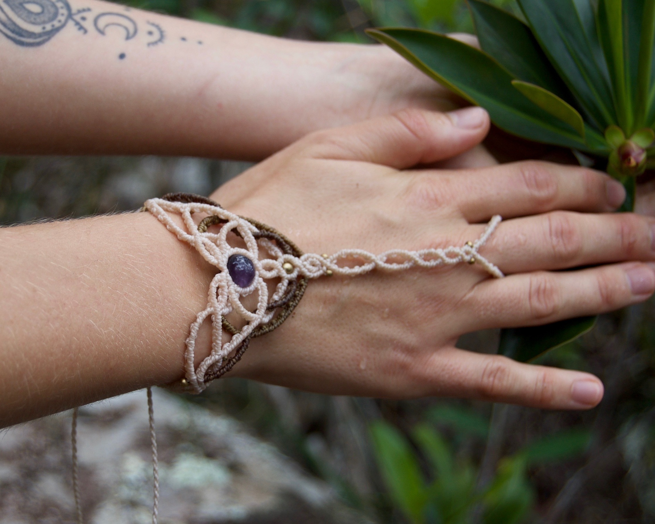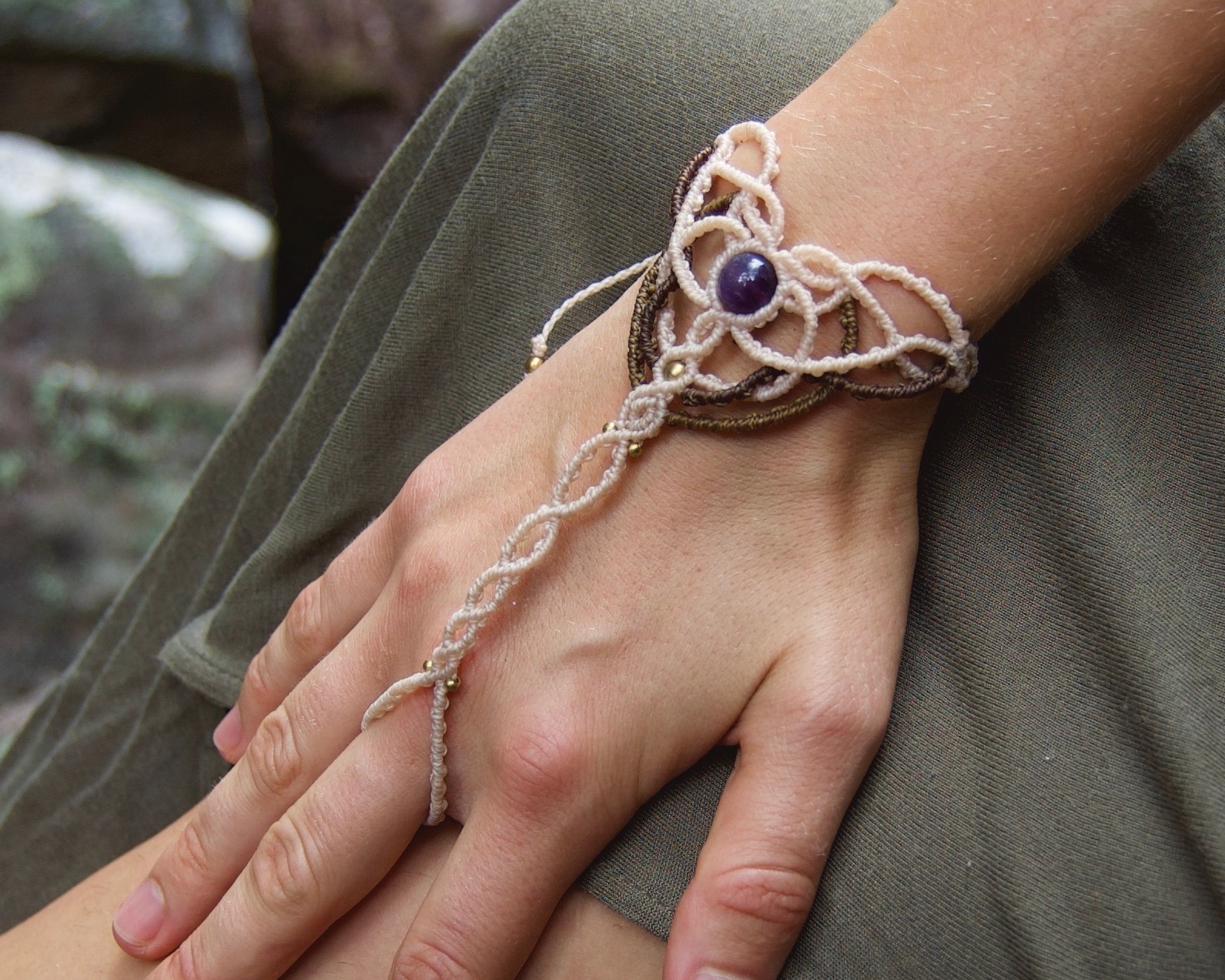 This macrame ring bracelet is made with Amethyst and high quality brass beads.